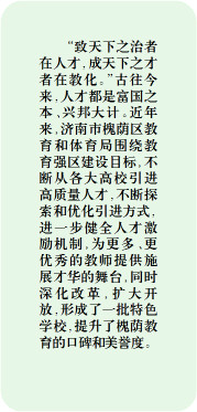 “致天下之治者在人才,成天下之才者在教化。”古往今来,人才都是富国之本、兴邦大计。近年来,济南市槐荫区教育和体育局围绕教育强区建设目标,不断从各大高校引进高质量人才,不断探索和优化引进方式,进一步健全人才激励机制,为更多、更优秀的教师提供施展才华的舞台,同时深化改革,扩大开放,形成了一批特色学校,提升了槐荫教育的口碑和美誉度。
