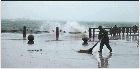 9月15日,烟台市出现降雨大风天气,滨海广场工作人员在清扫广场上的积水。 记者 吕奇 摄
