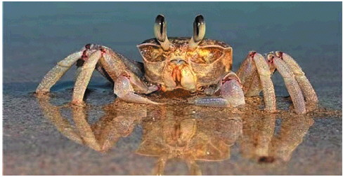 栖息在海滨沙滩上的沙蟹,两根长长的眼柄,就像两根火柴棒。沙蟹时常把整个身体埋在泥沙里,只将两只柄眼竖起露在外面,好像潜望镜一样,观察周围动静。