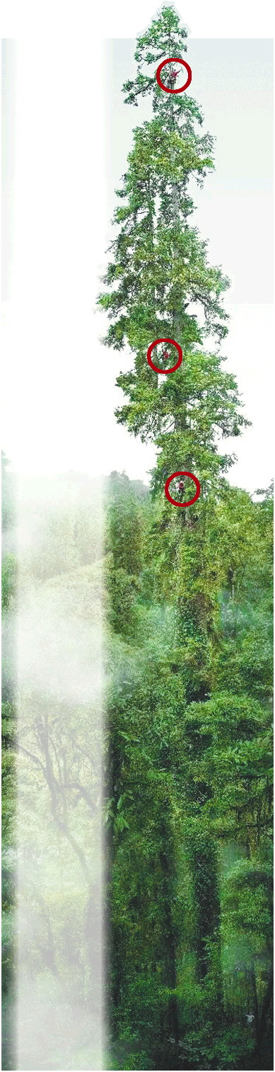 三个人分别在树顶附近利用100米长的金属直尺进行了高度测量,最后经过专家校正,得到的就是此次发布的83.4米的树高。