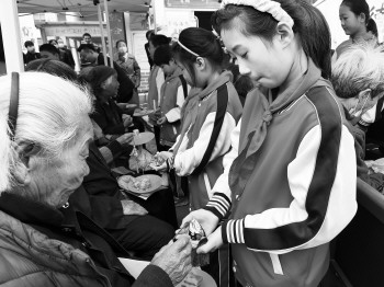 孩子们把做好的菊花香囊送给爷爷、奶奶。