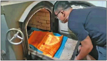 工作人员正在将宠物放进火化炉。