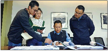 王建光(右二)与同事讨论城市道路设计方案。 记者 于泊升 摄