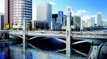 方案二为梁拱组合桥:新型组合体系,展现当代新貌。本方案采用梁拱组合桥,跨径为28m+46m+28m,桥宽52m,主拱圈外形采用抛物线形、箱型截面,桥墩位置设置景观桥塔,高于桥面16.8m,上部采用悬索造型,现代风格。景观塔柱顶部设圆形景观球,寓意天圆地方;桥头同样设四头象雕塑。