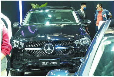 ◥一位观众看中一款奔驰车后,正在同销售人员交流。