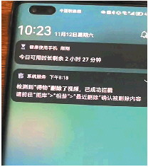 记者从该用户上传的视频看到,手机弹出的系统服务通知显示,“检测到‘得物’删除了视频,已成功拦截。请前往图库>相册>最近删除,确认被删除内容。”