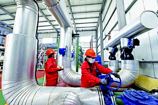 近日,胜利油田河口采油厂油气集输管理中心员工对“余热代气”节能降碳项目生产工艺流程进行巡查维护,保证安全高效生产。所谓“余热代气”,是指利用油气集输生产过程中采出水的余热能量替代天然气,既保证生产高效运行,又实现节能降耗。仅埕东联合站一个项目,每天就能节省天然气2500立方米,年节约天然气量90万立方米左右,每年减少碳排放量1990吨左右。