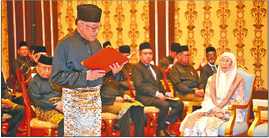 11月24日,在马来西亚吉隆坡的国家皇宫,安瓦尔(前左)在就职仪式上。 新华社发