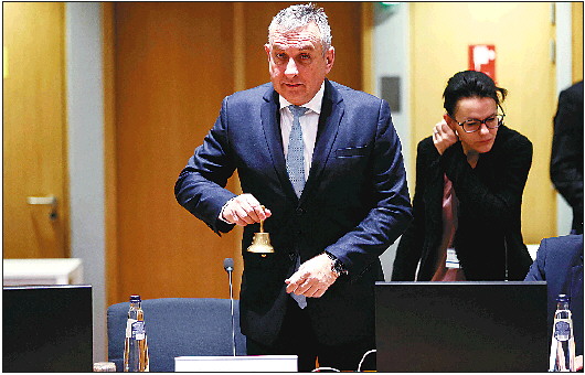 24日,在比利时布鲁塞尔,欧盟轮值主席国捷克工业和贸易部长西克拉在欧盟能源部长特别会议开始时摇响铃铛。 新华/法新