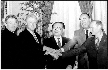 ▲2000年9月7日,由中国倡议的联合国安理会五个常任理事国首脑会议在纽约举行。江泽民同志(中)同法国总统希拉克(右二)、俄罗斯总统普京(右一)、英国首相布莱尔(左一)、美国总统克林顿(左二)握手合影。 本版图片均据新华社