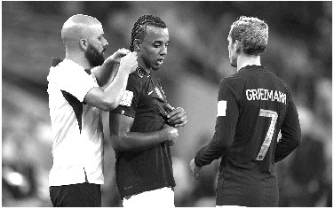 法国队教练组成员在比赛中帮助球员孔德(中)摘下项链。 新华社发