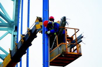 记者看到,两名维修工人身系安全绳,手戴劳保手套,将安装有点光源的保护板逐一拆卸,拆卸下来的保护板堆叠在皮卡车后方,虽然已经使用多年,但保护板没有一丝生锈的痕迹。岳煊告诉记者,这是为了保护桥梁结构不被铁锈腐蚀,在桥梁亮化设计之初就采用铝合金制的点光源保护板,且重量较轻,对大桥的结构安全也不会造成影响。