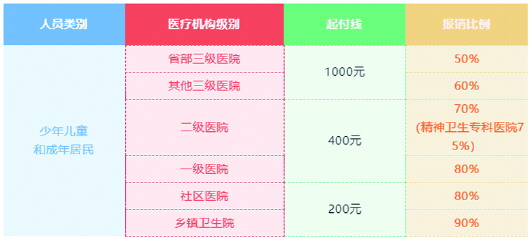 一个医疗年度内慢病就医起付线为200元;社区医院和乡镇卫生院无起付线;精神障碍无起付线。报销比例见图2。