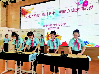 今年,学校依托任城区全面推进的优秀传统文化“两创”示范点建设工作,结合唐口街道本土丰厚的历史文化资源,打造了以“诚信”为主题的校园文化和班级文化。胡建坤告诉记者,通过开展书法、绘画、剪纸等传统文化体验课程,在校园文化节上举办传统文化展演等,让学生在明理诚信的环境中,增强时时讲诚信,事事讲诚信的意识,努力提高学生的思想道德素质。