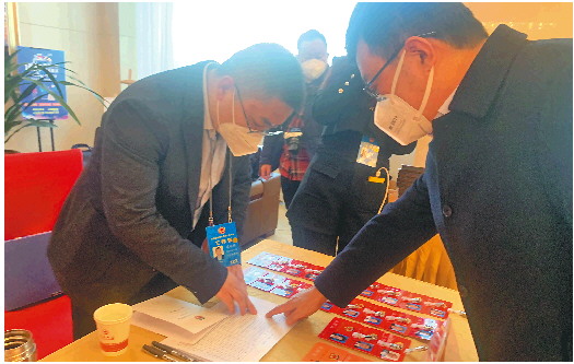 1月9日上午,在燕子山庄住地,政协委员们陆续向大会报到。在工作人员指引下,委员们签到、核对信息、领取会议材料,一气呵成。