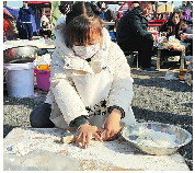 “小朋友真棒!”6岁的妹妹系着围裙,拿着盘子从妈妈的案板上盛来面剂子,随后便坐在自己的案板前工作起来,虽然一次擀的皮没有哥哥多,但一招一式也已经非常熟练,干净利索的动作引得周围食客称赞。