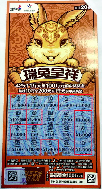 杨先生选了3张20元的“瑞兔呈祥”,一共中了50元,接着他又用这个奖金买了2张,第一张刚刮开第一行覆盖膜就出现了3个“兔子”标志,并且每一个“兔子”标志下面都对应着1000元奖金!光第一行就中了3000元!这是要中大奖的节奏啊!杨先生心里一阵激动,赶紧把剩余的覆盖膜一气刮开,最后全部刮完一共刮出了8个“兔子”标志,每一个标志下面都是1000元奖金,他兴奋的告诉销售员说自己中了8000元!
