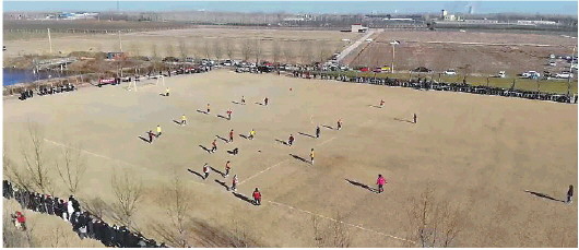 草皮枯黄,温度零下,球员们在场上享受足球,十里八村的乡亲搬着小马扎、带着保温杯前来观赛,现场足有上千人。球赛还在全网火爆出圈,更有球迷驱车几百公里来观赛,网友亲切地把八堡村乡村足球赛称为“村界杯”。
