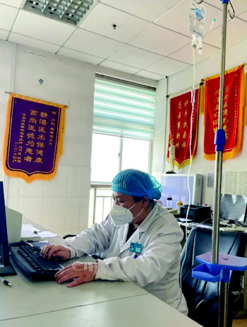 同事们都劝张霞放下工作好好休息休息,但她仍然坚持工作,还开玩笑说:“我在办公室输液又不耽误工作,还能给科室省床位留给其他需要的患者。”
