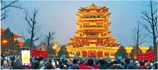 自1月30日,网友“萤火虫”在短视频平台分享了超然楼亮灯瞬间的视频以后,有关超然楼的话题持续登上同城热搜榜。每天傍晚,超然楼东侧广场上都会聚集数百名年轻人,他们高举手机等待超然楼亮灯,这种“仪式感满满”的默契成为社交新方式。