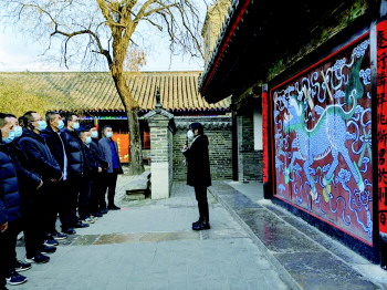 “每当衍圣公从内宅出来路过照壁时,跟班的差人必须高喊一声:‘公爷过犭贪了!’目的是提醒衍圣公到外面之后,一定要以德为本,常思贪欲之害,不忘廉洁初心…”日前,在孔府内宅门口照壁的《戒贪图》前,曲阜文化两创研究院现场教员魏洪玉正声情并茂地向学员讲解。