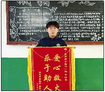 ◤招远市蚕庄初级中学学生牟子豪收到锦旗。 受访者供图