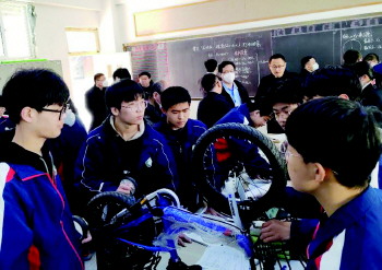 “物理是一门观察和实验为基础的科学,作为物理教师,我们自制教具的情形非常多。”潍坊实验中学物理教师金城告诉记者,“这次我们学习圆周运动这一单元,我们把四辆自行车搬进课堂,有同事从家里推来的代步工具,有同事家的儿童自行车。增加的六种自制教具,我和同事们用一个下午和一个晚上的时间,三四个人共同完成的,加上材料准备,大概七八个小时,尽管用时比较长,但是效果非常明显。同一个单元,我们还把课堂放到过操场,让孩子们骑行体验。”