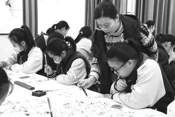 济宁市实验初中以学生爱好为出发点,以“特色课堂”为着力点,开展丰富多彩的校园社团特色活动。社团活动的开展不仅丰富了学生的校园文化生活,学生还在小社团、大舞台上放飞着自己的梦想。图为书法社团的学生们在老师的指导下练习书法。 记者 姬生辉 通讯员 李云龙 摄