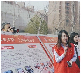 ◤“志愿红”热情地向往来居民宣讲和引导服务。