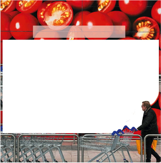 2月26日,在英国伦敦一家超市,一名顾客走过印有番茄图案的墙贴。 新华/路透