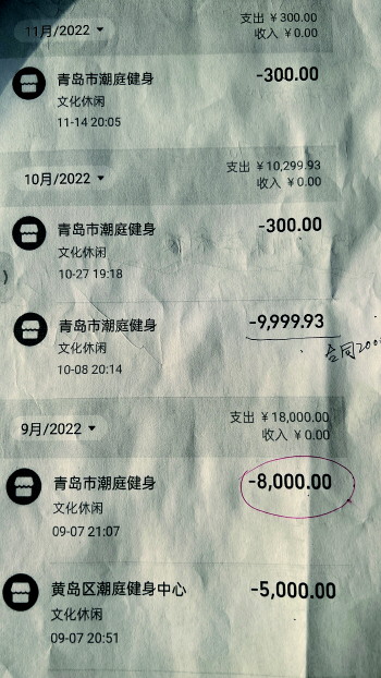 去年6月,陈女士花费6840元在青岛市黄岛区长江中路485号国汇金融中心4层的潮庭健身国汇店开了私教健身课。7月7日又花了10100元签订了新的健身课合同。“从第一次付费到最后一共续费10次花了66940元。都是上课的时候教练跟我说课不多了让我续,出于对教练的信任,我就直接刷他们那里的pos机付费。”陈女士说,去年12月,因为疫情的原因,潮庭健身国汇店暂停营业,她的健身课程也被搁置了。又因忙于其他事情,就想把未上的课退了。之后,陈女士联系了教练,健身教练说门店暂停营业查不到剩余课程信息,等上班后他再联系陈女士。