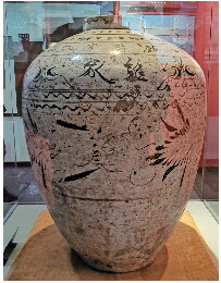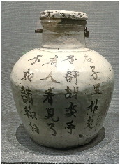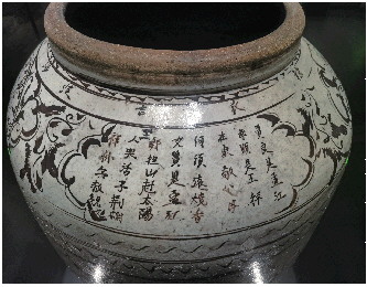 酒须豪饮,但不要贪杯。同样还是盛酒器,也有控制酒量的广告词。如邯郸博物馆陈列有一件明代白釉褐花酒海(如图②)。口沿下书一圈文字:“隆庆五年(1571年)二月,韩氏吉造酒海”。酒海是古代对大型盛酒容器的称谓。如唐代诗人白居易在《就花枝》诗中就写到酒海——“就花枝,移酒海,今朝不醉明朝悔。”我们熟悉的小说《水浒传》第八十二回中:朝廷派宿太尉带着御酒去梁山招安,在宣读完诏书后,“(宿太尉)叫开御酒,取过银酒海,都倾在里面,随即取过镟杓舀酒,就堂前温热,倾在银壶内。”古代一些场合,尤其是在基层民众中,酒要像《水浒传》里描绘的那样用勺子或瓢舀着喝,酒海因为体形庞大且易于饮者取放饮用,因此广受追捧。有意思的是在酒海肩部还写有一篇词:“贤良是孟江(姜),孝顺是王祥。在家敬父母,何须远烧香。女贤是孟江(姜),二郎担山赶太阳。三人哭活子(紫)荆树,王祥卧兵(冰)救亲娘。”(如图③)