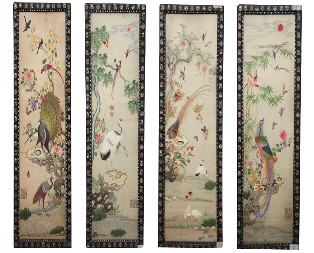 清缎地丝绣花鸟屏四条