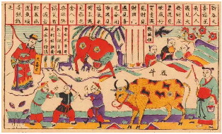 “春牛图”在中国人民心目中寓意着丰收和幸福,寄托了对春天最美的期许。过去几乎每户农家都有一幅春牛图,以便按时耕作、指导生活。它是旧时百姓民俗时空观的体现和日常生活的具体指导,也是古代人们关于春文化传承的图像记忆。