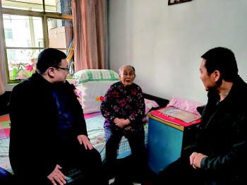 在王桂英家里,一行人送上爱心物资,关切地询问老人健康情况,了解老人生活习惯,叮嘱要照顾好身体,并祝福老人健康长寿。