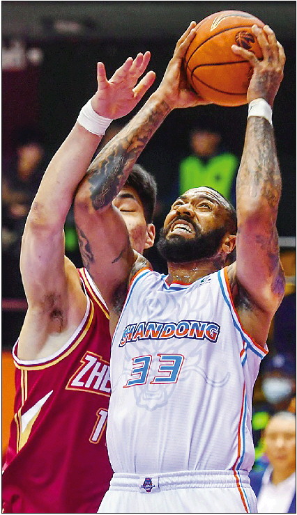 凭借吉伦沃特(右)的稳定发挥,山东男篮最终赢球锁定常规赛第八。 新华社发