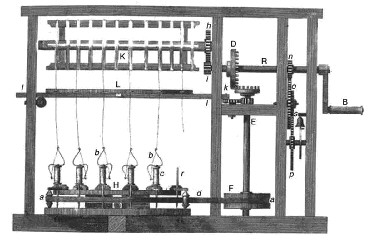 ▲ 缫丝机(下)和捻丝机(上)。十一世纪,中国发明了一种缫丝机,已经开始机械化的纺织生产。1716年,英国人约翰·隆贝发明了捻丝机,建立了第一个工厂。尽管两种机器都是由手摇柄驱动,但捻丝机通常由磨坊的水车驱动。
