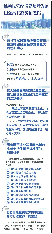 林武强调,加快民营经济高质量发展,关键要构建起服务支持民营经济发展的体制机制。为此,我省将优化调整全省民营经济工作领导体制,出台关于支持民营经济高质量发展的若干意见,健全部门联席会议制度,建立民营经济发展指数和监测指标体系,定期分析研判民营经济形势,以最大决心、最高规格、最强措施,进一步增强民营企业发展信心、完善靠前服务民营企业的体制机制、彰显山东政府支持民营经济发展的强大决心。要聚焦民营企业发展突出制约,着力强化企业诉求闭环解决、惠企政策落实、诚信政府建设、公平市场竞争、全链条融资支持、涉企执法服务规范、要素保障、政企常态化沟通、民营企业家权益保障、企业家荣誉激励等10个方面机制,为民营企业高质量发展提供有力保障。