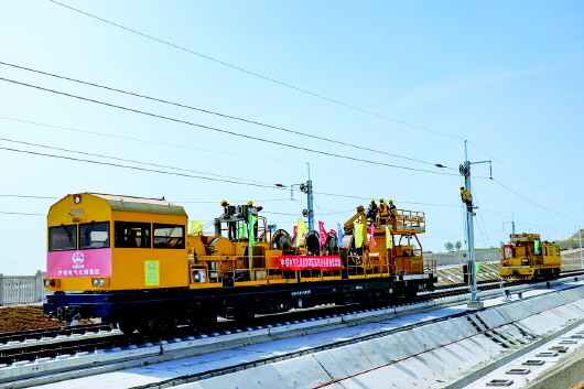 莱荣高铁首条接触网导线在莱阳市莱西北至莱阳丁字湾区间成功架设。本报通讯员 寇伟博摄