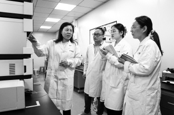 李明丽(左一)带领团队开展药物研究。