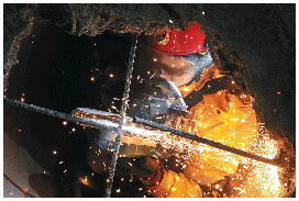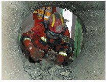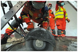 ▲救援人员破拆封堵救援通道的水泥管道。