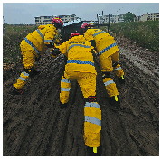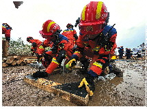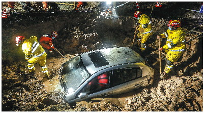 ▲连日的降雨使现场泥泞不堪,但这并不能阻挡救援人员前进的脚步。