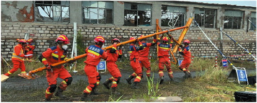▲救援人员制作、加工各种木制支撑(构件),以便稳定被撑物的结构,确保进入废墟作业人员及被困伤员的生命安全。