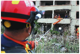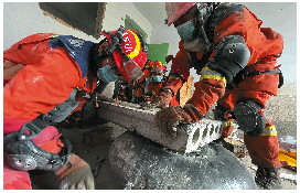 ▲救援人员对受损建筑进行固定支撑,保证自身及被困人员安全。