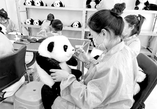 胡玉路告诉记者,他们工厂制作的仿真熊猫玩偶在学习借鉴传统裘皮技艺的基础上,选用羊皮为原材料,同时采用新工艺并首创嵌入式硅胶脚垫和硅凝胶填充技艺,让熊猫的脚掌、鼻子等更加逼真,填补了市场空白,也让他们制作的仿真熊猫无论从外形、毛发质感、重量感等各种纬度都更接近真实的熊猫。