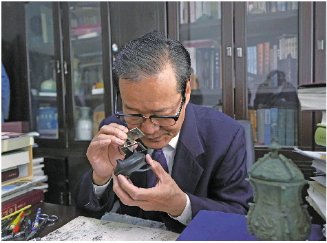 孙敬明在使用放大镜观察文物。