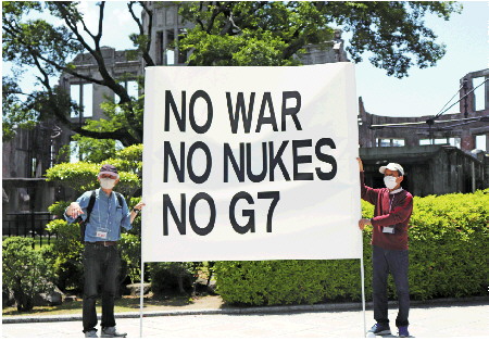 ◥14日,在广岛和平纪念公园原子弹轰炸遗址前,日本民众举着“不要战争、不要核武器、不要G7”等标语,强烈抗议G7峰会在广岛召开。 新华社发