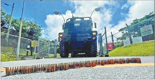 宫城秋乃将收集到的美军废弃子弹摆放到驻日美军训练营地门口进行抗议。