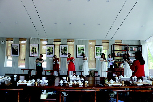 活动现场,学员们伴随着悠缓的音乐,跳起了茶舞——采摘、挑青、摇青、敬茶,每一个动作都将茶的工艺完美地融合。一个个优美的动作,无不体现"茶之韵""茶之灵""舞之魂"。茶舞,立体地展现了茶文化,领略了茶文化的独特魅力。在一盏茶的时光里,大家放下忙碌、盲目和茫然,让内心回到安定的状态,远离周围的喧嚣,感受内心的平静。
