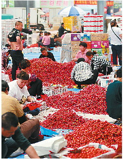 作为全国最大的樱桃交易市场之一,张格庄大樱桃市场辐射全国各大省份,年交易量突破3000万斤,交易额突破2.5亿元。这里吸引着周围的果农以及五湖四海的客商。